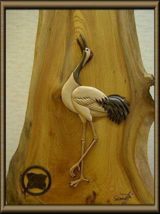 ★ バードカービングの特技を組木絵に合体させた丹頂鶴が 上野美術館に展示されました。 |